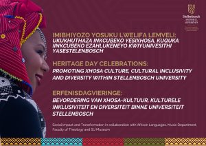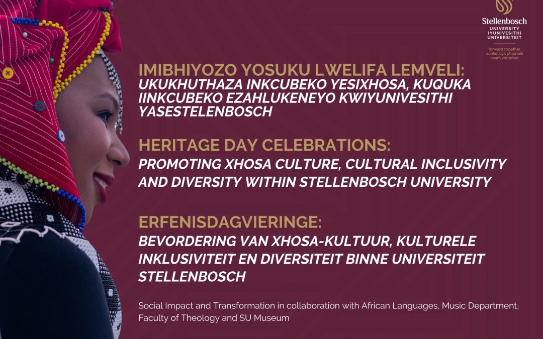 SU Social Impact and Transformation in collaboration with African Languages, Music Department, Faculty of Theology and SU Museum would like to extend an invitation to the Imibhiyozo yosuku lwelifa lemveli: Ukukhuthaza inkcubeko yesixhosa, kuquka iinkcubeko ezahlukeneyo, Heritage day celebrations: Promoting Xhosa culture, cultural inclusivity and diversity within Stellenbosch University, Erfenisdagvieringe: Bevordering van Xhosa-kultuur, kulturele inklusiviteit en diversiteit binne Universiteit Stellenbosch