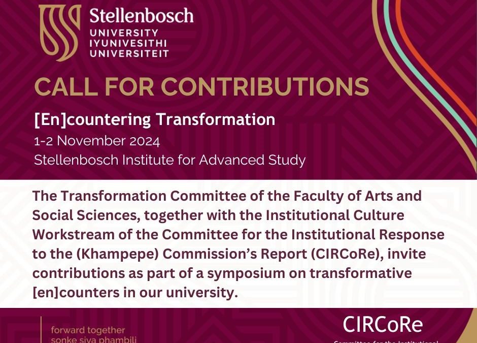 The critical scope of this symposium is staked out by the notion of [en]counter: to attend to transformative encounters and energies sparking institutional cultural change, as well as those tactics — deliberate, well-intentioned or unintended — that counter transformation and cultural change. The symposium will provide a forum where members of the Stellenbosch University community can speak critically and constructively to transformation and institutional cultural change.