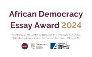 To advance the study of democracy by African students, the Sentrum vir Navorsing oor Demokrasie (CREDO) at Stellenbosch University is pleased to announce the third edition of our annual essay writing initiative – the African Democracy Essay Award 2024. We are also very proud to once again, welcome the South African office of the Konrad-Adenauer-Stiftung (KAS) as our partners in this initiative.